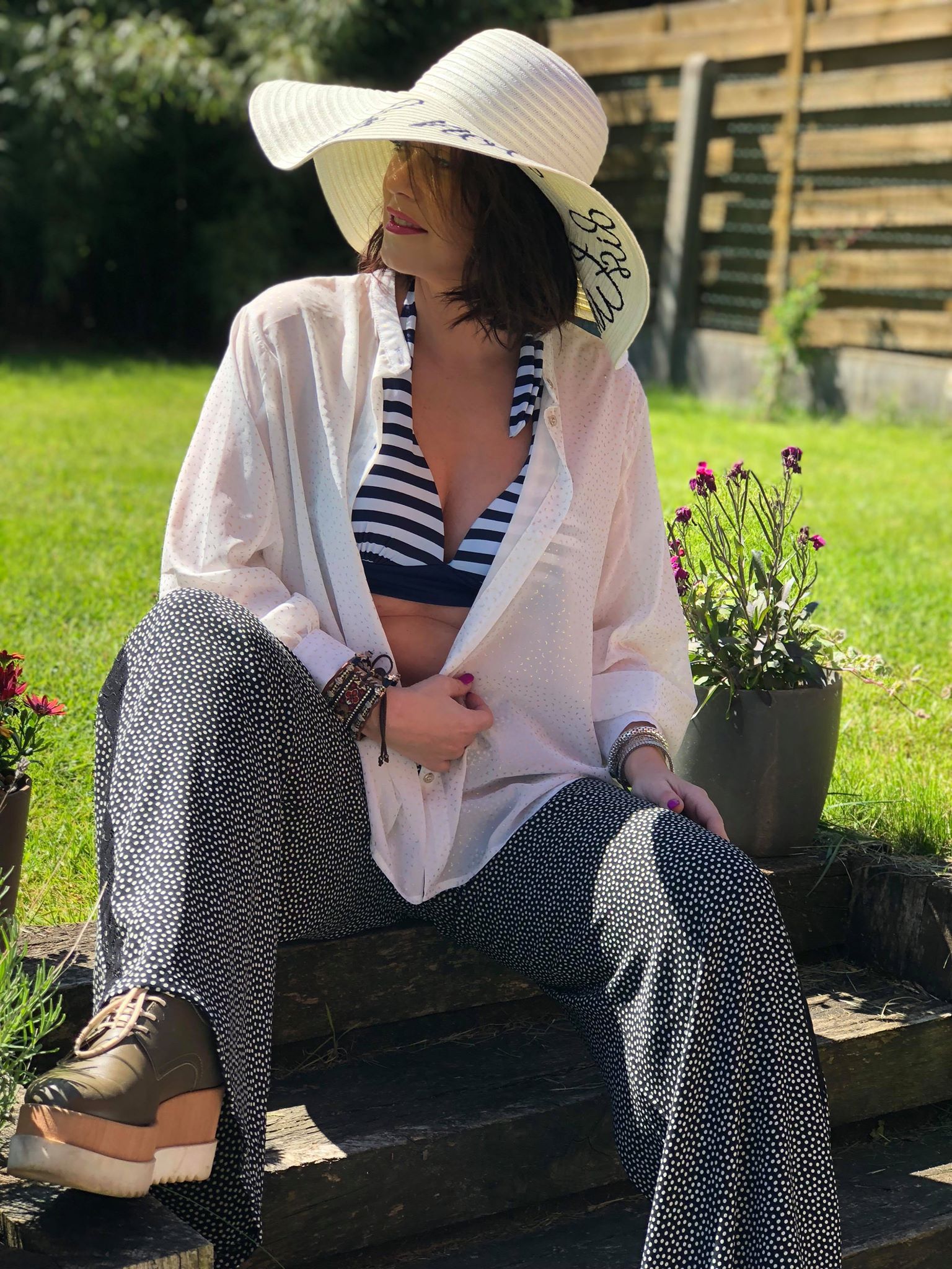 Le pantalon oversized, c’est vraiment le truc à avoir cette année dans sa garde-robe. La bande noire sur le côté allonge la silhouette, c’est tout bénef. J’étais en maillot dessous, histoire de tomber la chemise pour profiter du soleil. Et dessus, ce chemisier encore terrible puisque ses manches sont chauve-souris gigantesques.